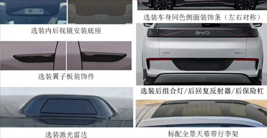 外观方面,新款海狮05基本延续老款EV车型设计语言,细节处优化升级。前包围格栅尺寸加大以提升散热效率,DM-i与EV版本仅在装饰件上有细微差异——EV车型采用黑化风格,DM-i车型侧窗配备镀铬装饰。两款车型均提供丰富选装配置,如翼子板装饰件、后组合灯、全景天幕带行李架等,EV车型还可选装激光雷达,满足不同用户需求。